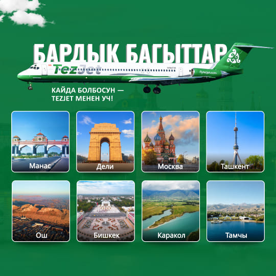 TezJet авиакомпаниясы, Бишкек шаарында жайгашкан туруктуу авиакомпания, Бишкек – Ташкент багыты боюнча өзүнүн биринчи эл аралык каттамын ишке киргизгенин кубануу менен билдирет.
